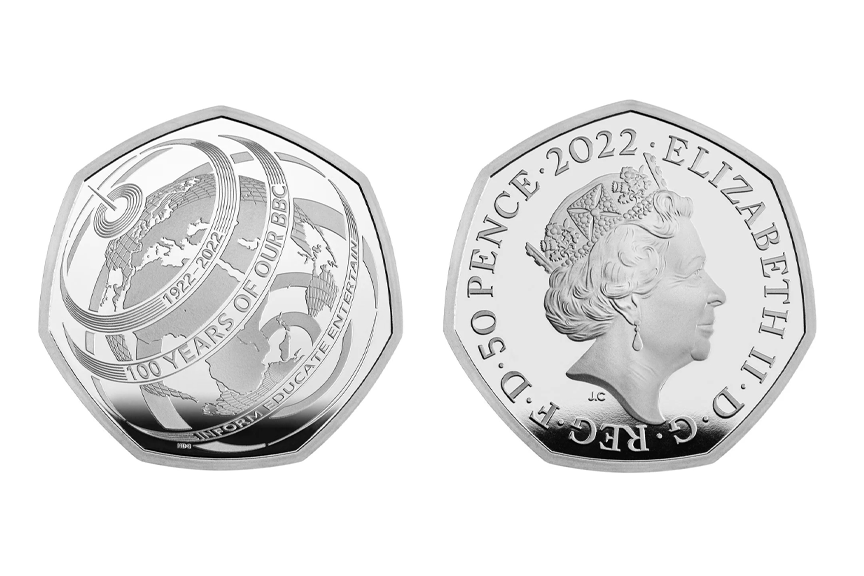 - The Royal Mint ha presentado una nueva moneda de 50 peniques para conmemorar el 100 aniversario de la BBC, con el lado de la cabeza todavía mostrando un retrato de la reina Isabel Segunda.